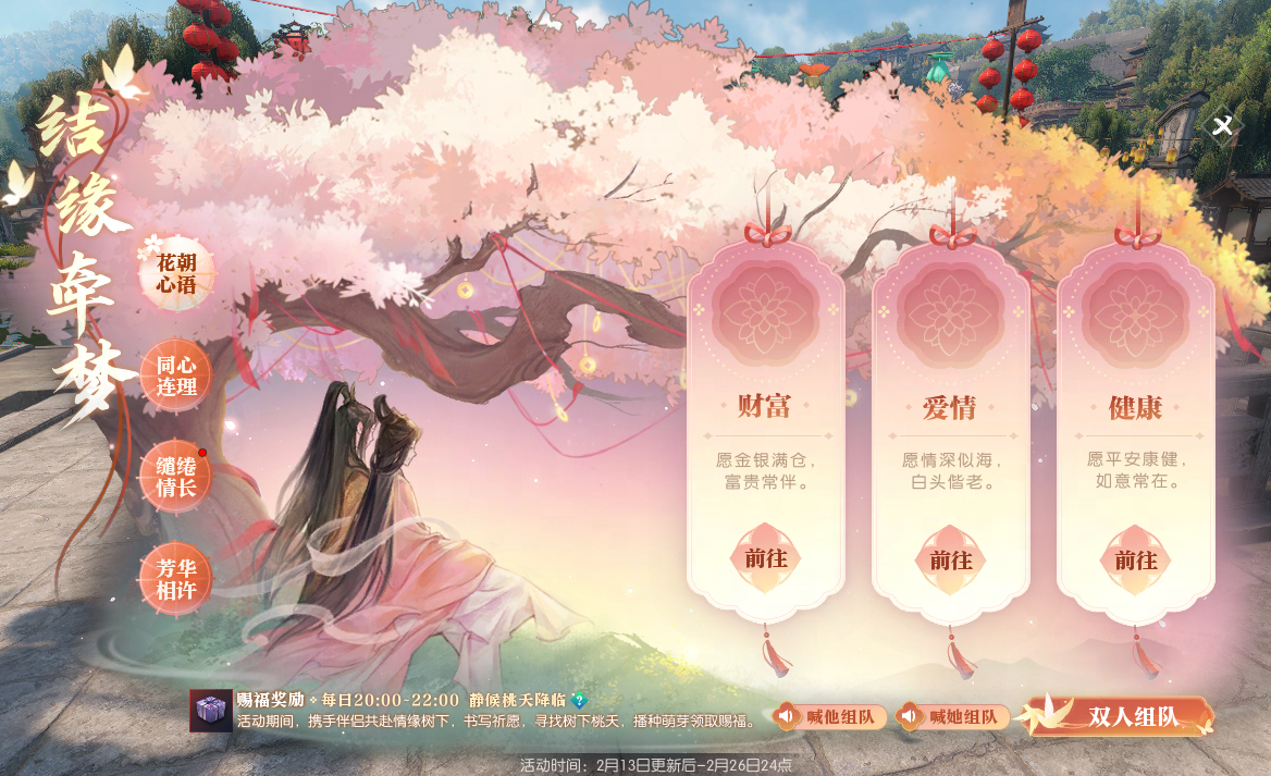 除了应景绝美的外观,《逆水寒》推出的情人节专属浪漫活动“结缘牵梦”也给玩家们增添了很多情趣和欢乐,直接把游戏变成大型恋爱综艺现场,助力有情人爱意升温。这几天一进玩法,氛围甜得能齁死人,玩家们纷纷拉着CP往这儿跑,扎堆打卡这新出的约会示爱宝藏圣地。